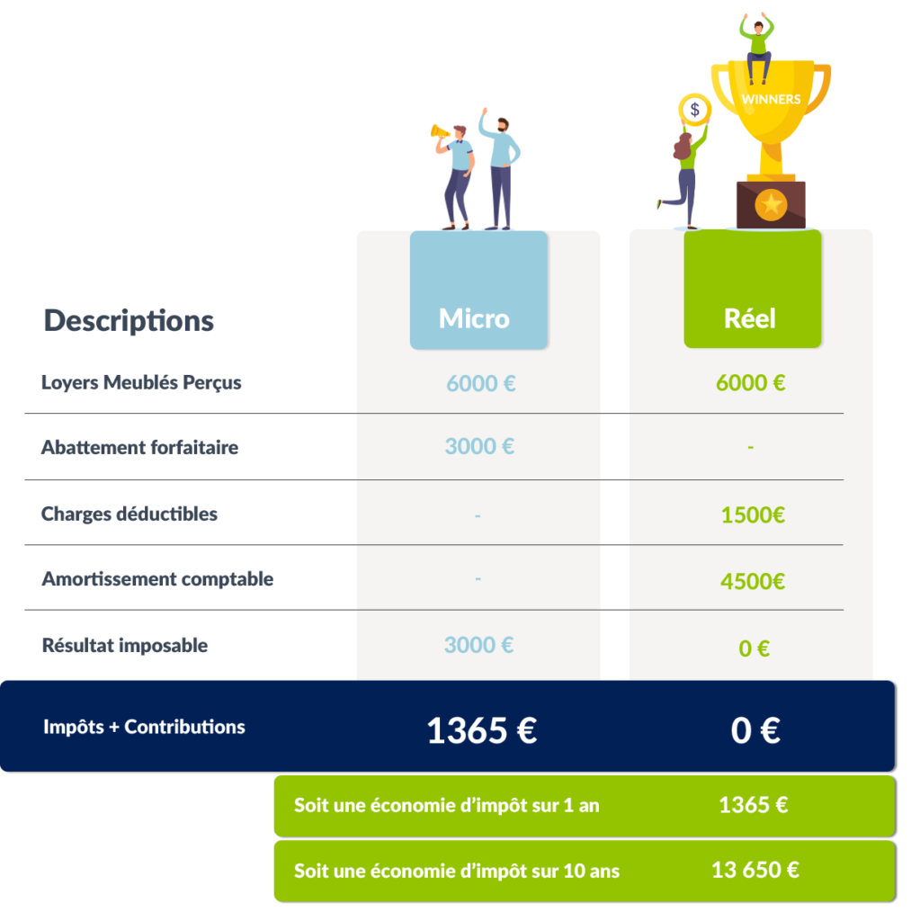 L’avantage du réel meublé est qu’un amortissement comptable calculé sur votre bien immobilier est comptabilisé en charge même s’il n’est pas décaissé, ce qui réduit sensiblement votre base imposable à l’impôt sur le revenu, voire dans bon nombre de cas, annule complètement l’impôt sur vos loyers perçus. Contactez-nous pour une étude détaillée.